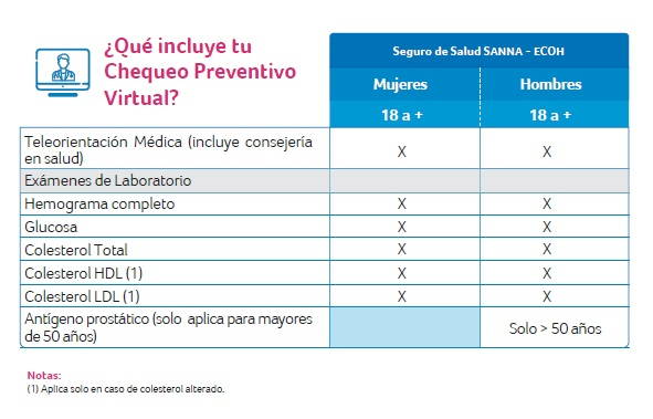 Cuidar tu salud y la de tu familia es muy importante para nosotros. Por eso, nos da gusto presentarte, además del Programa de Chequeo Preventivo, nuestro nuevo servicio de Chequeo Preventivo Virtual, para que juntos sigamos protegiendo tu bienestar durante esta coyuntura COVID-19. Con este beneficio podrás recibir una tele orientación médica y exámenes de laboratorio a domicilio.